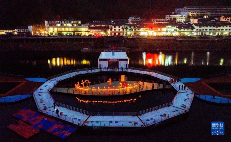 2月2日在浙江省杭州市淳安县里商乡拍摄的里商仁灯元宵表演(无人机照片)。 当日,浙江省杭州市淳安县里商乡举行2023元宵节花灯巡游,为当地山乡增添了热闹的元宵氛围。 作为浙江省非物质文化遗产的里商仁灯有500多年的历史,做工精巧、图案逼真。近年来,杭州市淳安县里商乡立足发展非遗旅游项目,建设非遗产业园,将里商仁灯制作、表演等开发为当地特色的体验性旅游项目,助力乡村旅游。 新华社记者 徐昱 摄