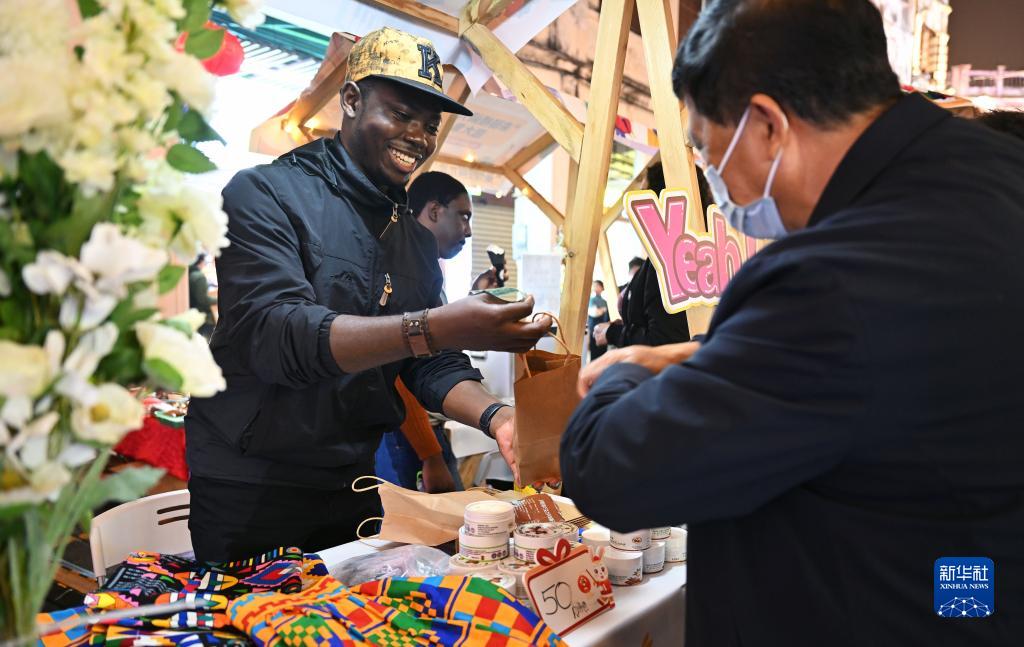 2月3日,加纳摊主在海口骑楼老街售卖本国特色商品。