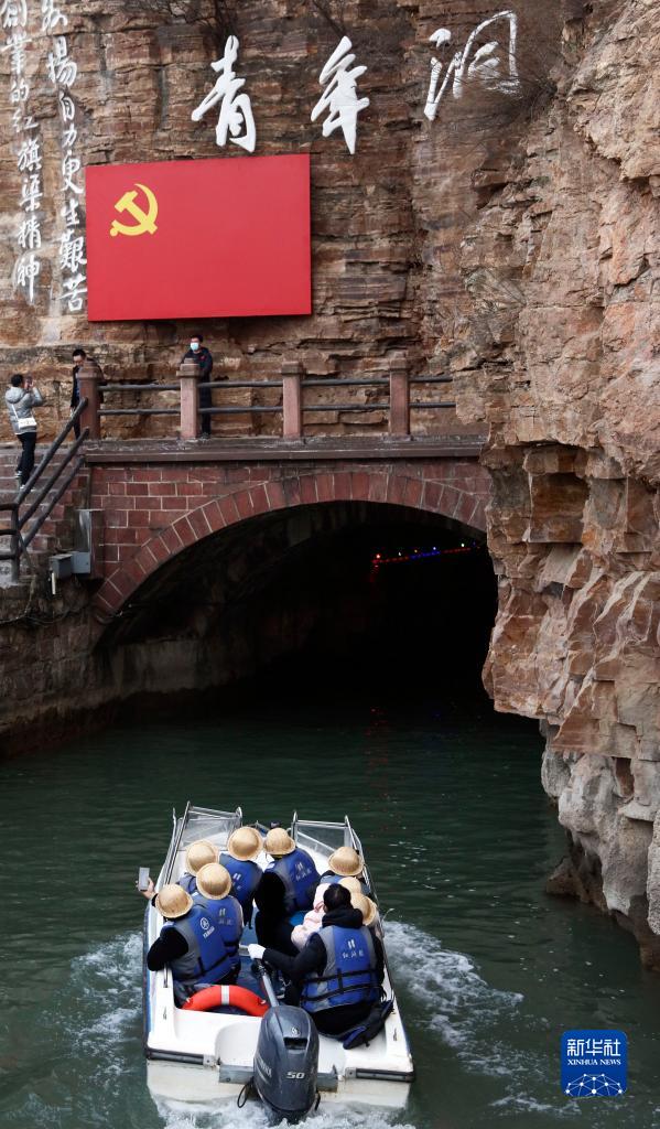 2月5日,游客乘船游览旗渠景区青年洞。 当日是农历正月十五元宵节,在河南安阳林州市,不少市民选择到红旗渠景区参观游览,感受红色文化。 新华社记者 兰红光 摄