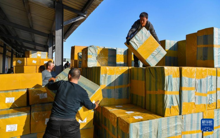 工人在新疆塔城地区一家外贸企业货场搬运即将出口哈萨克斯坦的小家电(2月4日摄)。 新华社记者 胡虎虎 摄