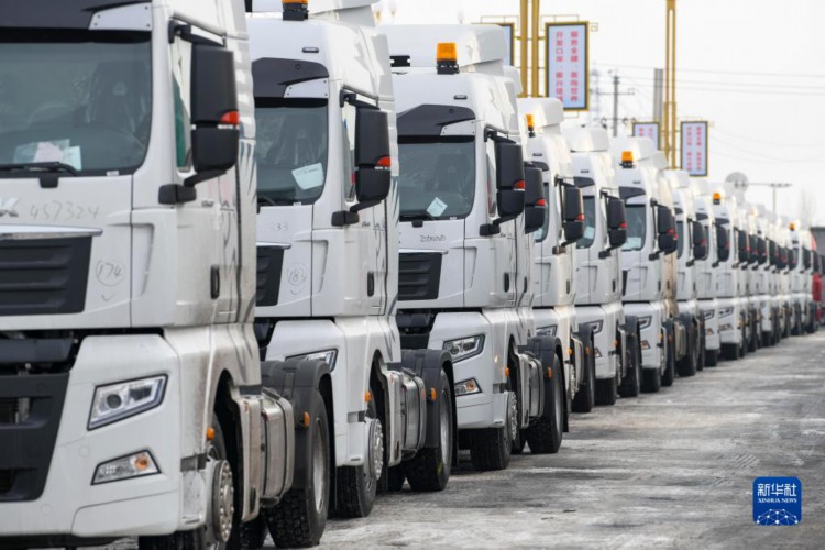 出口中亚国家的卡车在巴克图口岸等候出境(2月4日摄)。 新华社记者 胡虎虎 摄