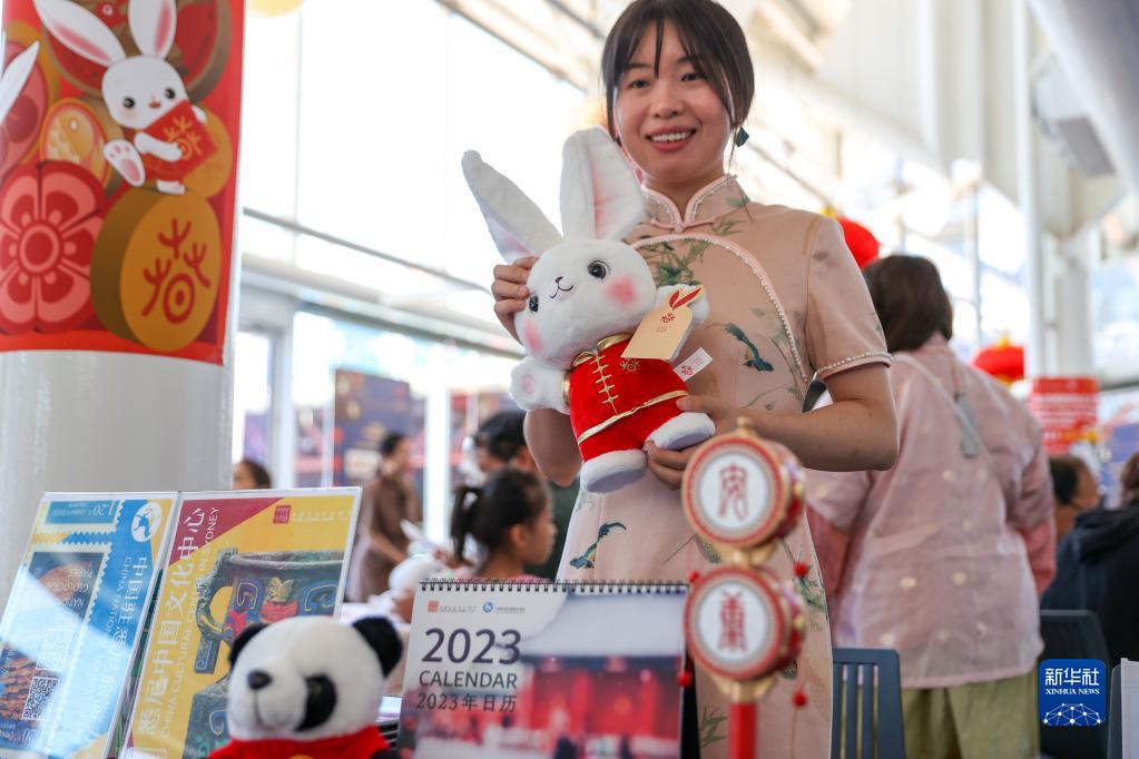 2月4日,在澳大利亚悉尼海事博物馆,工作人员在“欢乐春节——走进博物馆过大年”文化体验活动中向游客展示兔年吉祥物。