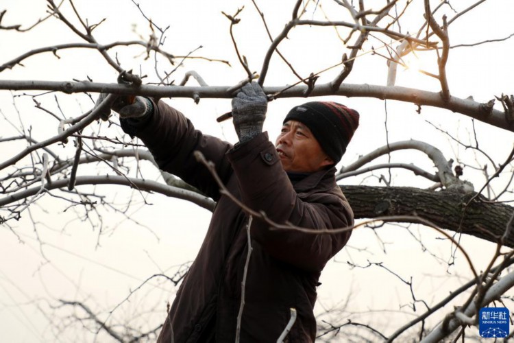 2月6日,石家庄市赵县精园梨果专业合作社果农在梨园给梨树修剪枝条。