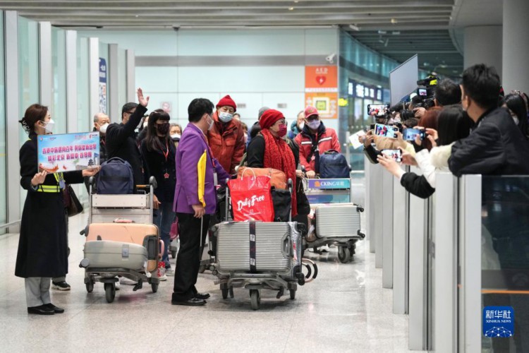 2月6日,内地与港澳人员往来全面恢复后,香港赴北京首个旅游团抵达首都国际机场。