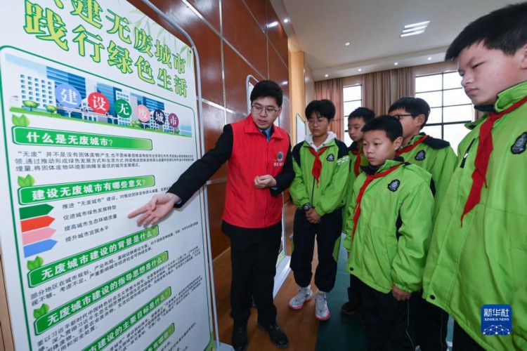 2月7日,在杭州市临安区潜川镇的潜川小学,杭州市生态环境局临安分局的党员志愿者给学生讲解“无废校园”相关知识。 当日,杭州市生态环境局临安分局在杭州市临安区潜川小学开展以“无废知识进校园,逐梦绿色向未来”为主题的开学第一课,普及低碳环保、资源循环利用的“无废城市”及“无废校园”概念。 新华社记者 徐昱 摄