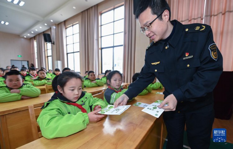 2月7日,杭州市生态环境局临安分局的党员志愿者在潜川小学向学生发放“无废校园”宣传单并讲解。 当日,杭州市生态环境局临安分局在杭州市临安区潜川小学开展以“无废知识进校园,逐梦绿色向未来”为主题的开学第一课,普及低碳环保、资源循环利用的“无废城市”及“无废校园”概念。 新华社记者 徐昱 摄