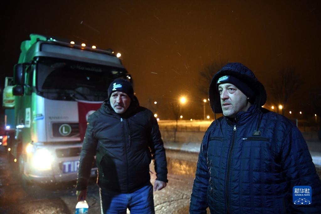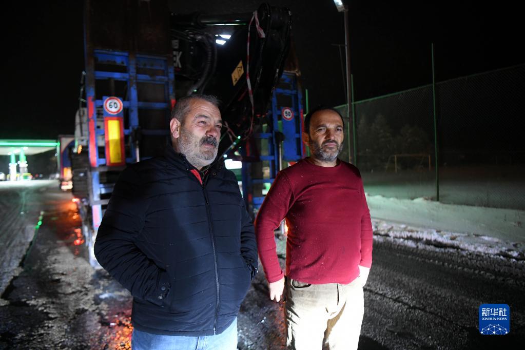 2月6日晚,在土耳其伊斯坦布尔至安卡拉公路上,货车司机艾哈迈德·莫里斯(右)告诉记者,他驾驶重型挖土机前往灾区加济安泰普省,将参与当地救援工作。 土耳其灾害与应急管理署7日发布的最新统计数据显示,6日发生在土耳其的强烈地震已造成该国3381人死亡、两万余人受伤。 新华社记者 沙达提 摄
