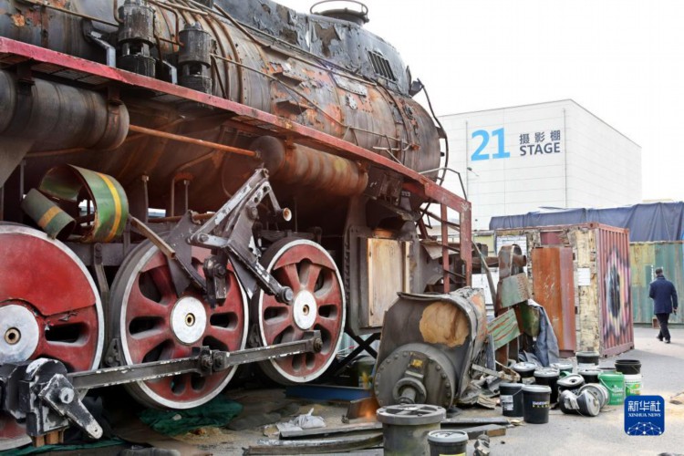 2月8日,青岛东方影都影视产业园置景车间外的一个道具火车头。
