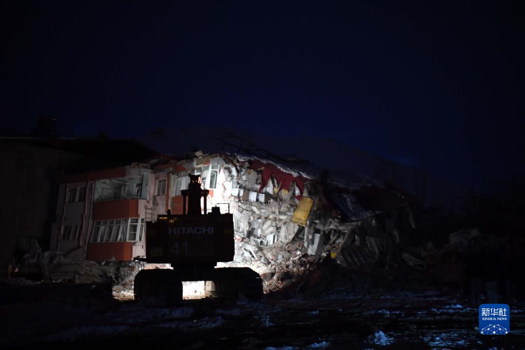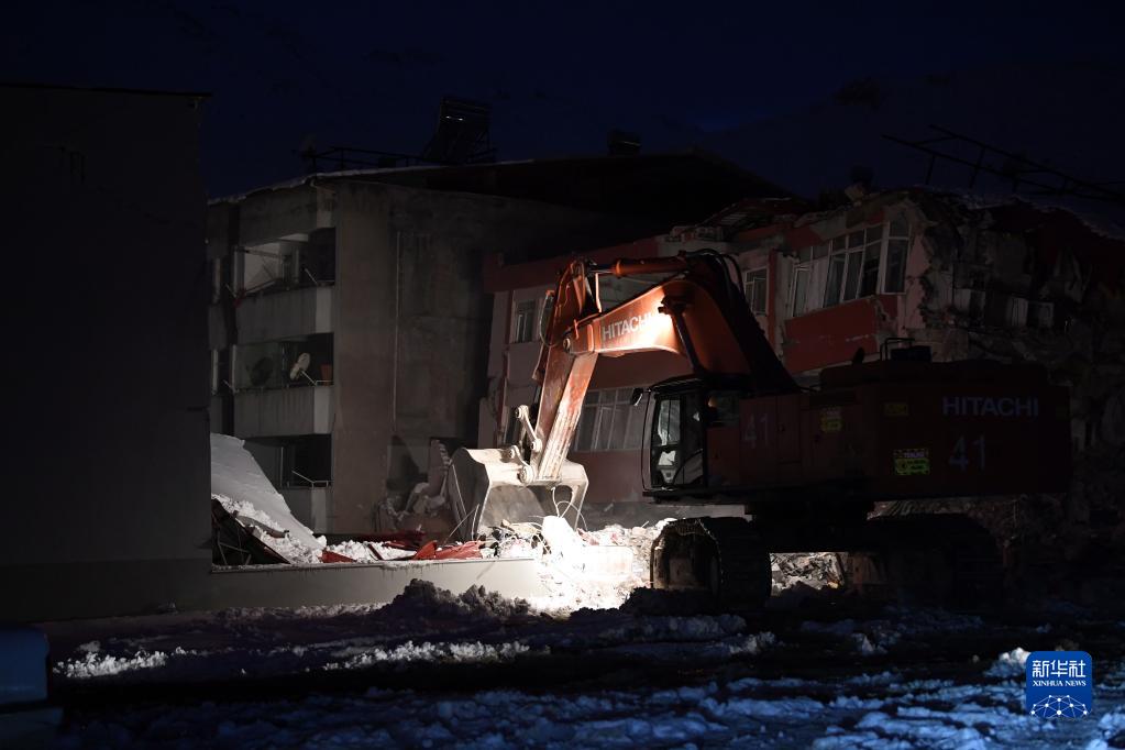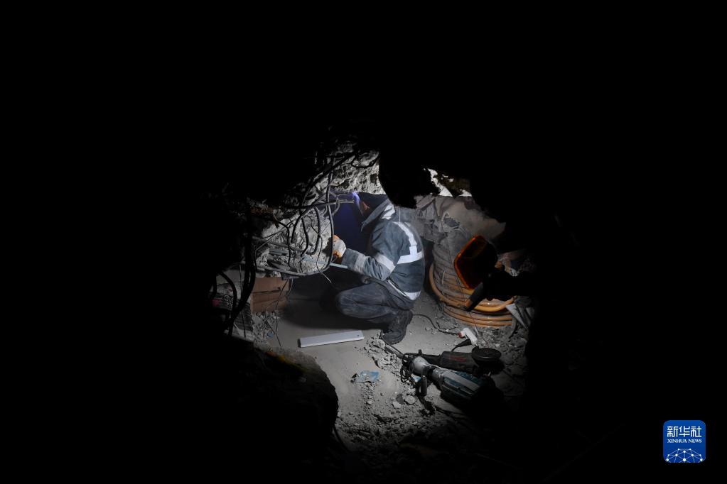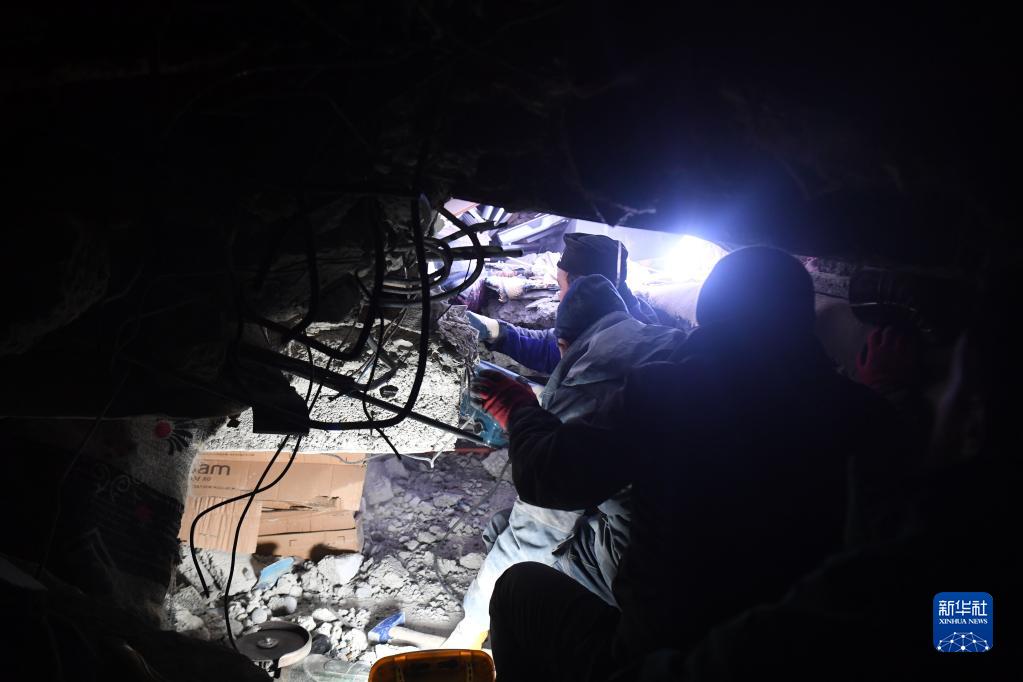 2月7日晚,在土耳其卡赫拉曼马拉什省南部的埃尔比斯坦地区,救援人员在一处地震废墟搜救。 土耳其副总统福阿德·奥克塔伊8日凌晨表示,土耳其境内地震死亡人数升至5894人,另有34810人受伤。 新华社记者 沙达提 摄