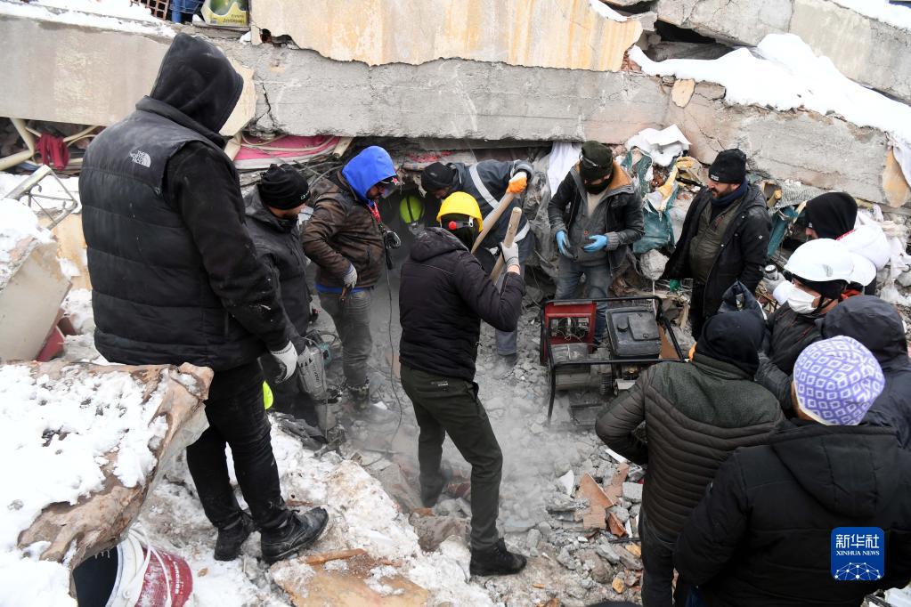 2月7日,在土耳其卡赫拉曼马拉什省南部的埃尔比斯坦地区,救援人员在一处地震废墟搜救。 土耳其副总统福阿德·奥克塔伊8日凌晨表示,土耳其境内地震死亡人数升至5894人,另有34810人受伤。 新华社记者 沙达提 摄