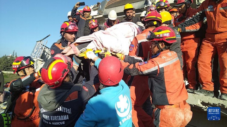在土耳其南部地震重灾区哈塔伊省安塔基亚市,中国救援队同土耳其救援队合作,于当地时间9日下午救出一名被埋在楼房废墟下的女性幸存者。新华社记者 王腾飞 摄