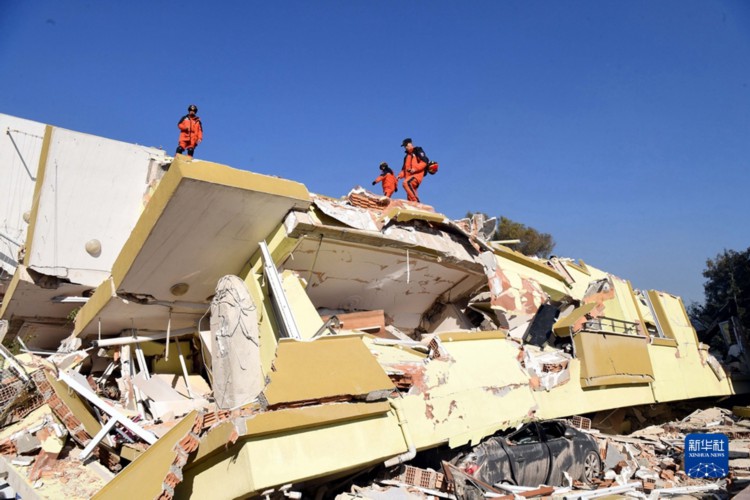 2月9日,中国救援队队员在土耳其哈塔伊省安塔基亚市的受损建筑上开展救援工作。