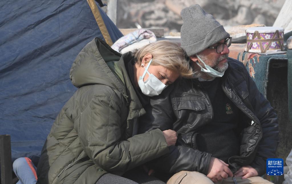 2月11日,人们坐在土耳其哈塔伊省安塔基亚市一处地震废墟旁。