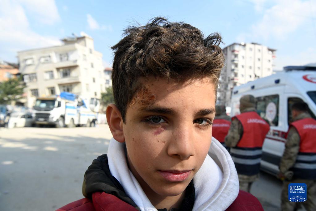 2月11日,在地震中受伤的12岁男孩萨比提走在土耳其哈塔伊省安塔基亚市街头。