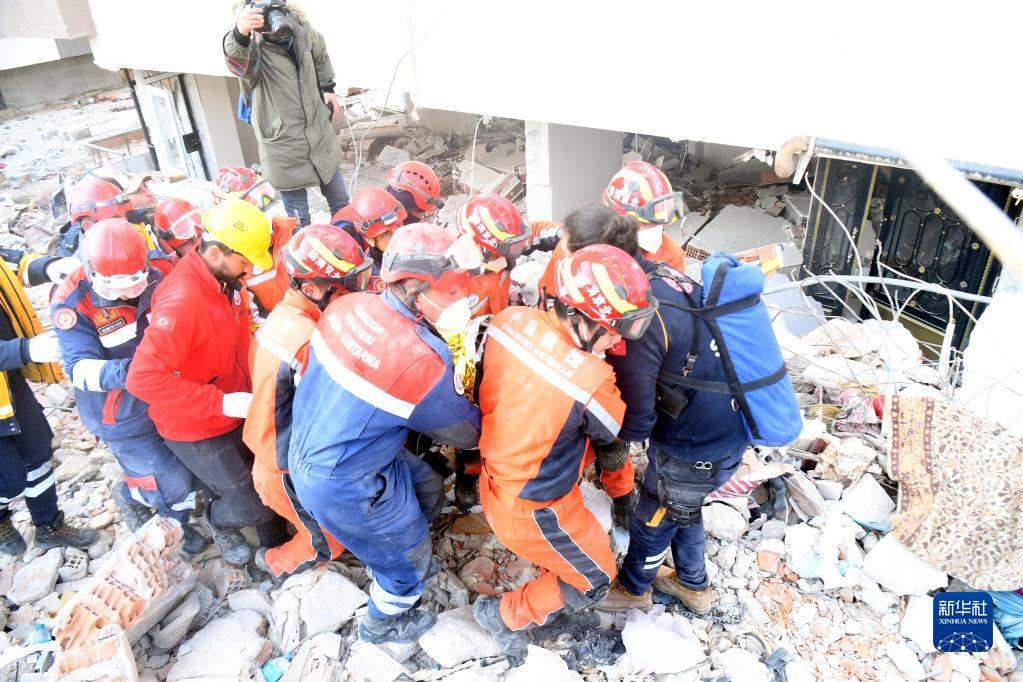 2月12日,在土耳其哈塔伊省安塔基亚市,中国救援队转移一名救出的幸存者。新华社记者 沙达提 摄 新华社土耳其安塔基亚2月12日电(记者武思宇 王峰)当地时间12日下午,正在土耳其哈塔伊省安塔基亚市实施搜救的中国救援队营救出一名幸存者。 12日上午,中国救援队在此前营救出第四名被困人员位置附近的街区开展排查工作,在接到当地居民求助信息后,救援队立刻派出人员携带生命探测仪器赶往一栋5层居民楼废墟展开搜救。救援队向废墟内呼喊时听到一名成年男子的应答,他说自己左腿被埋压无法动弹,但能看到有光线透入。