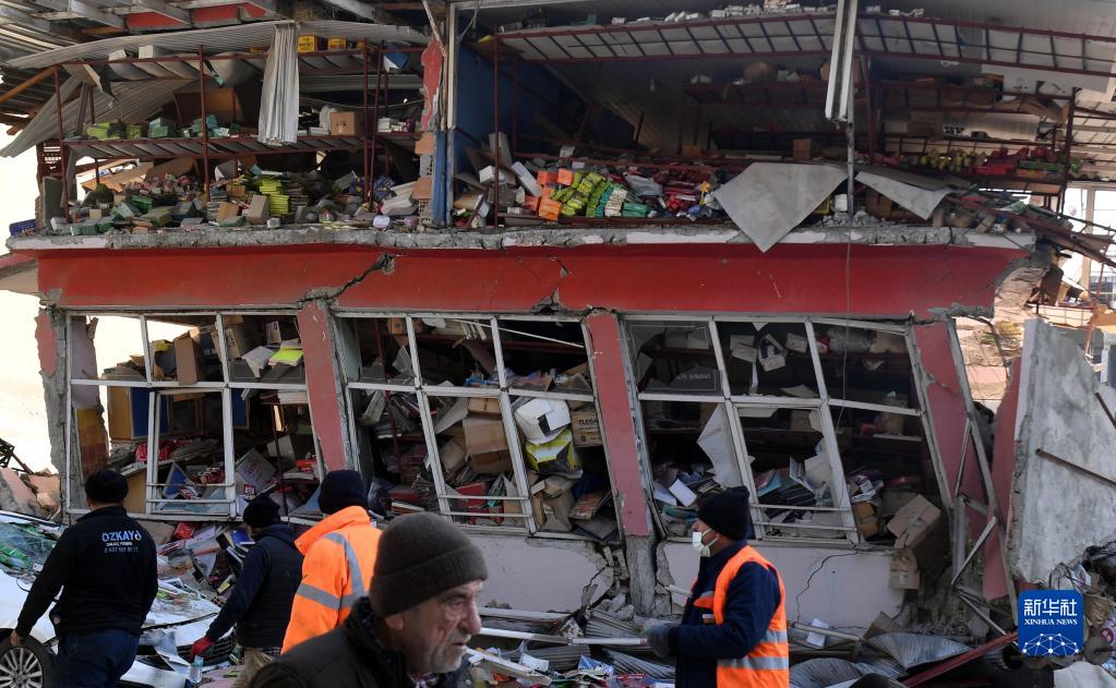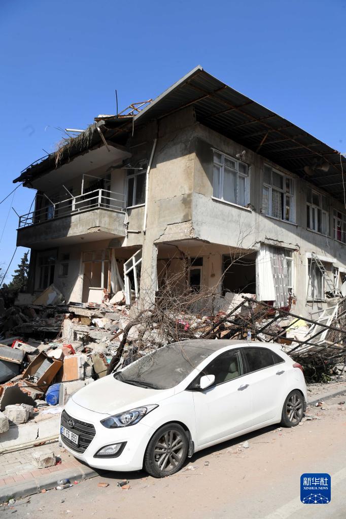 这是2月10日在土耳其哈塔伊省安塔基亚市拍摄的遭地震损毁的建筑。 土耳其卫生部长科贾10日午夜说,土耳其南部靠近叙利亚边境地区6日发生的强烈地震已在土造成20213人死亡、80052人受伤。科贾说,在受灾的10个省份中,哈塔伊省灾情最为严重,地震死伤人数分别为6205人和17823人。 新华社记者 沙达提 摄