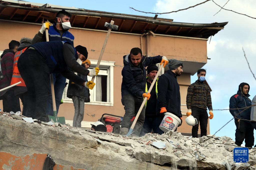 2月10日,人们在土耳其哈塔伊省安塔基亚市参与救援。 土耳其卫生部长科贾10日午夜说,土耳其南部靠近叙利亚边境地区6日发生的强烈地震已在土造成20213人死亡、80052人受伤。科贾说,在受灾的10个省份中,哈塔伊省灾情最为严重,地震死伤人数分别为6205人和17823人。 新华社记者 沙达提 摄