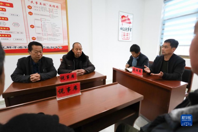 在陇南市徽县银杏树镇高坪村,“民事直说委员会”成员调解村民邻里纠纷(2月11日摄)。