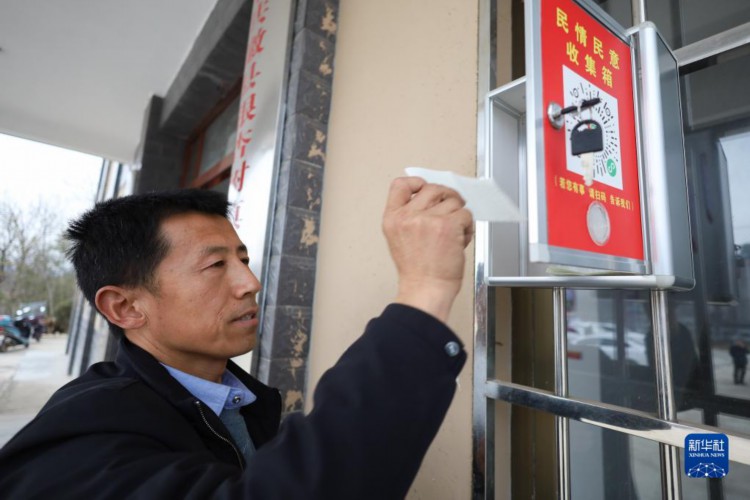在陇南市徽县银杏树镇高坪村,“民事直说委员会”成员取出“民情民意”收集箱里的群众来信(2月11日摄)。