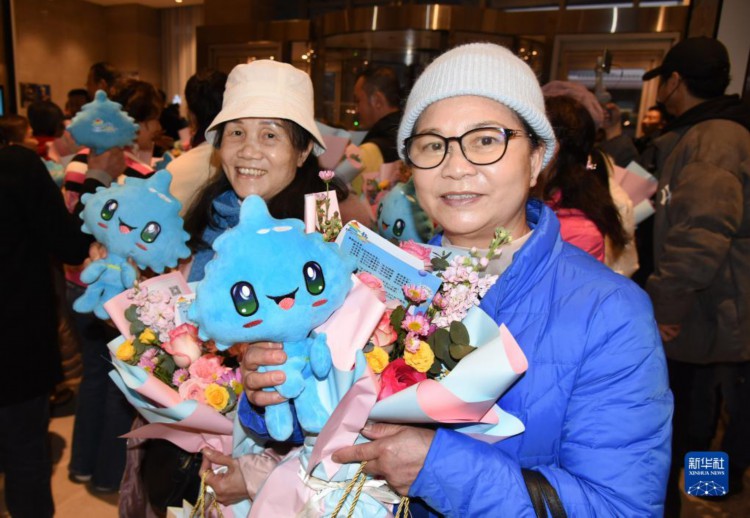 2月12日,来自香港的游客黄丽深(右)在欢迎仪式上展示收到的鲜花和玩偶。