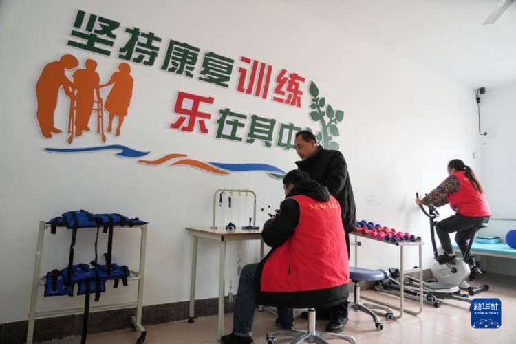 2月12日,在山东邹城市太平镇如康家园内,残疾人在工作人员的指导下进行康复训练。
