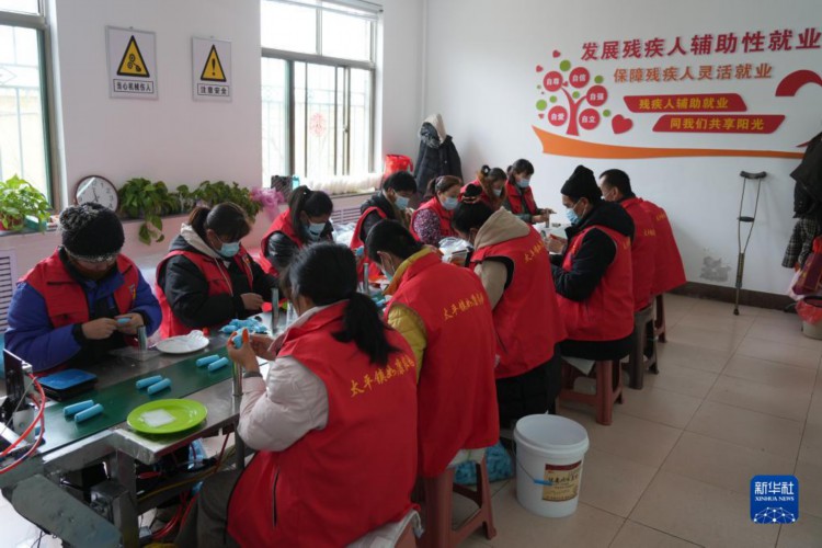 2月12日,在山东邹城市太平镇如康家园内,残疾人在进行彩色橡皮泥生产加工。