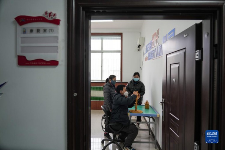 2月12日,在山东邹城市钢山街道龙山社区如康家园内,残疾人在工作人员陪护下进行康复训练。