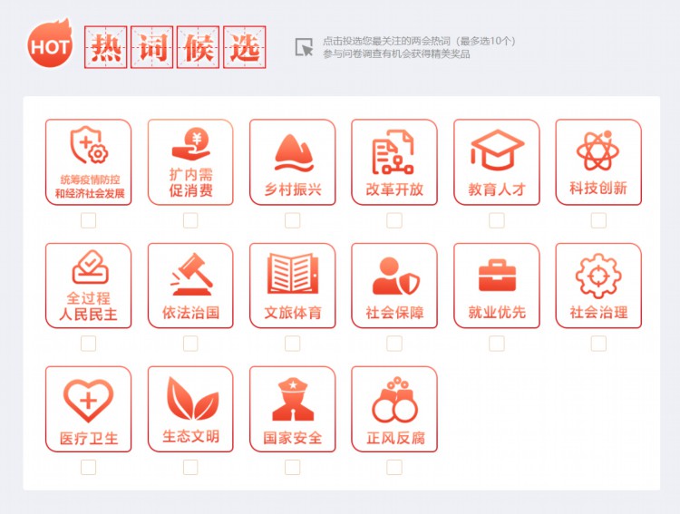 2、选择您关注的热词(最多不超过10个)进行投票并回答调查问卷,参与答题越多、获奖概率越大。
