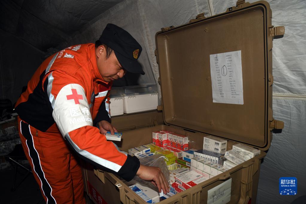 2月13日,在位于土耳其哈塔伊省哈塔伊体育馆外的中国救援队营地,医生检查药品。