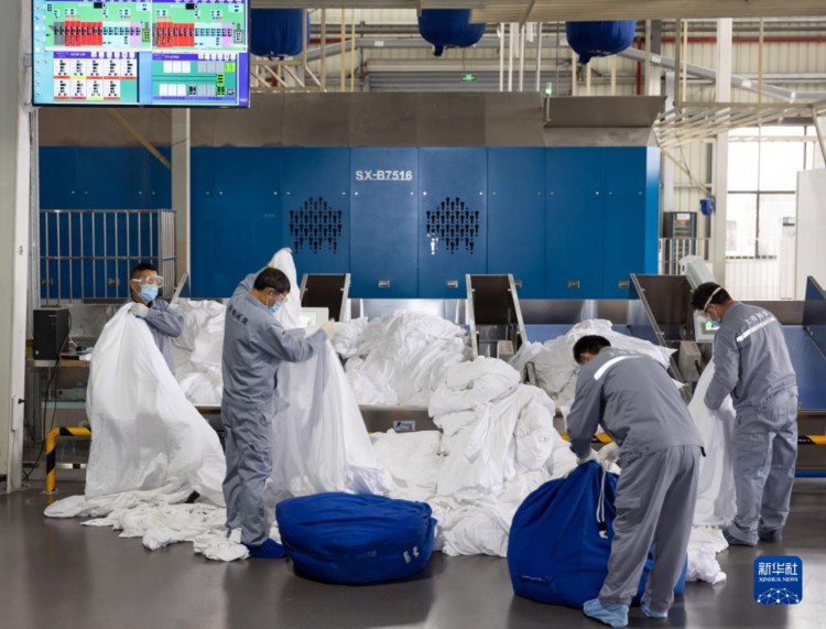 2月14日,分拣员根据布草洁净程度进行分拣归类。