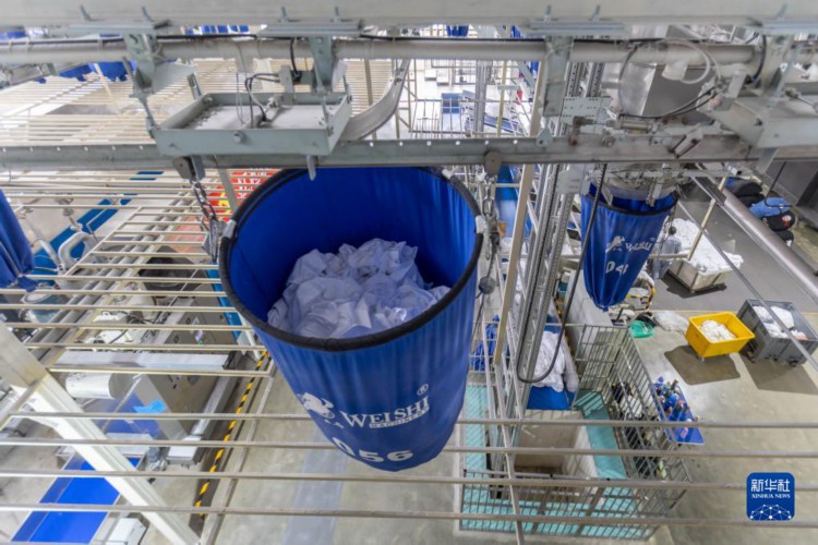 2月14日,在华铁旅服上铁勤佳洗涤厂,装满待清洗卧具的布草吊袋按照自动化洗衣系统指示运转。