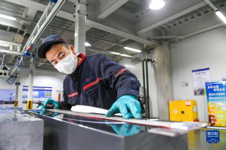 2月14日,包头一家硅材料生产企业的工人在车间测量单晶硅体尺寸。