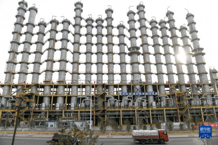 2月14日拍摄的内蒙古通威高纯晶硅有限公司的精馏塔。