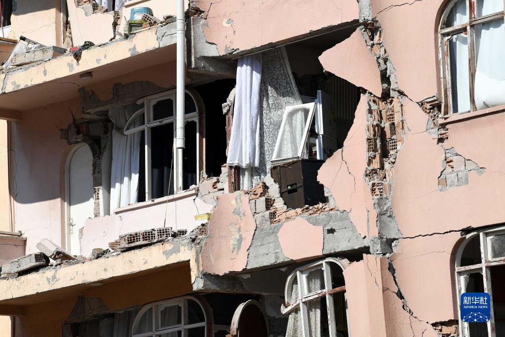 这是2月14日在土耳其哈塔伊省安塔基亚市拍摄的因地震损毁的建筑物。