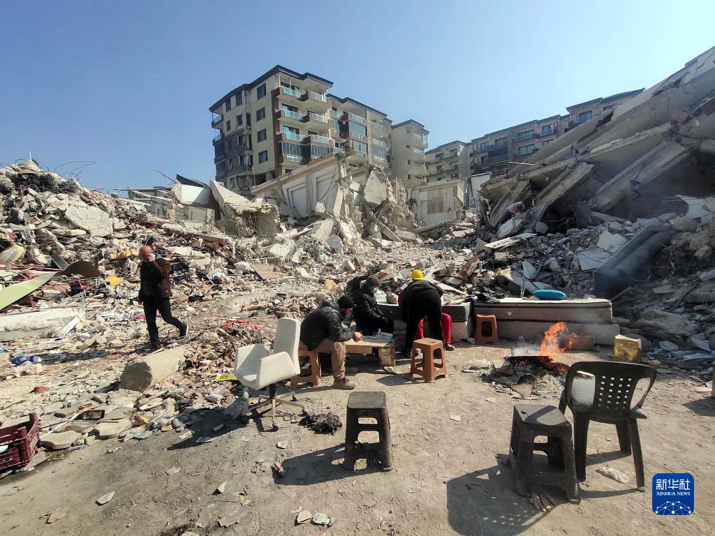2月13日,在土耳其哈塔伊省安塔基亚市,人们在地震废墟旁休息。