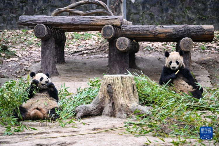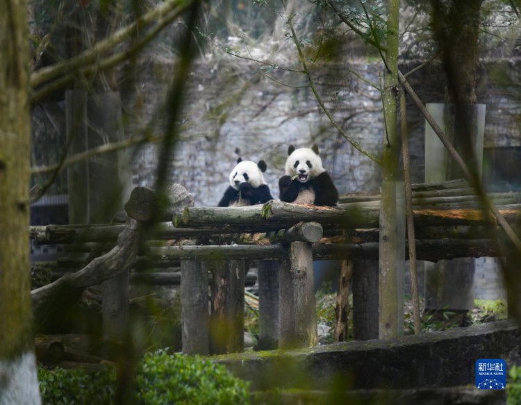 2月15日,在中国大熊猫保护研究中心都江堰基地,大熊猫在玩耍。