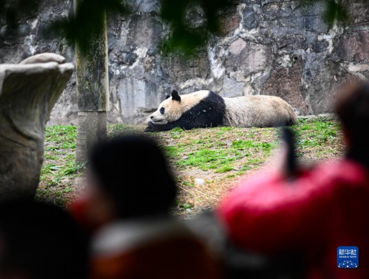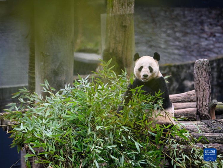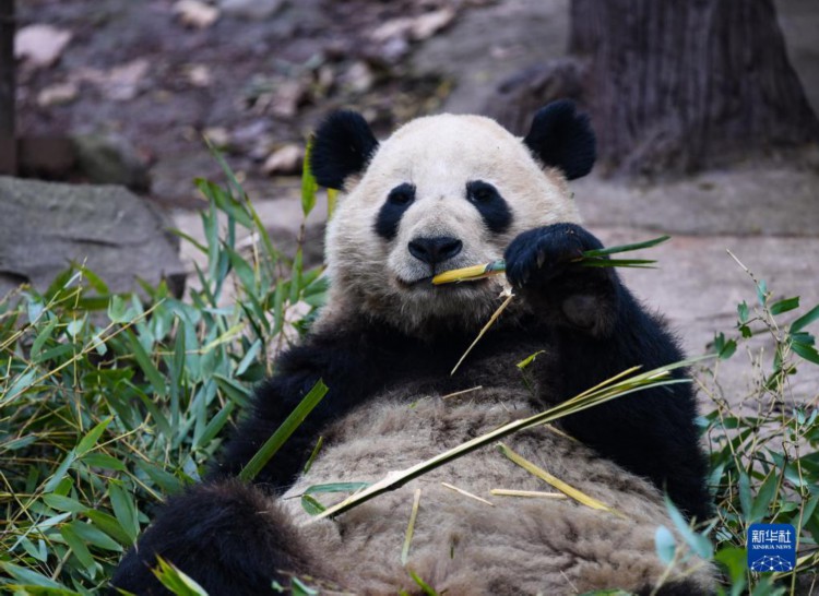 2月15日,在中国大熊猫保护研究中心都江堰基地,大熊猫在吃竹子。