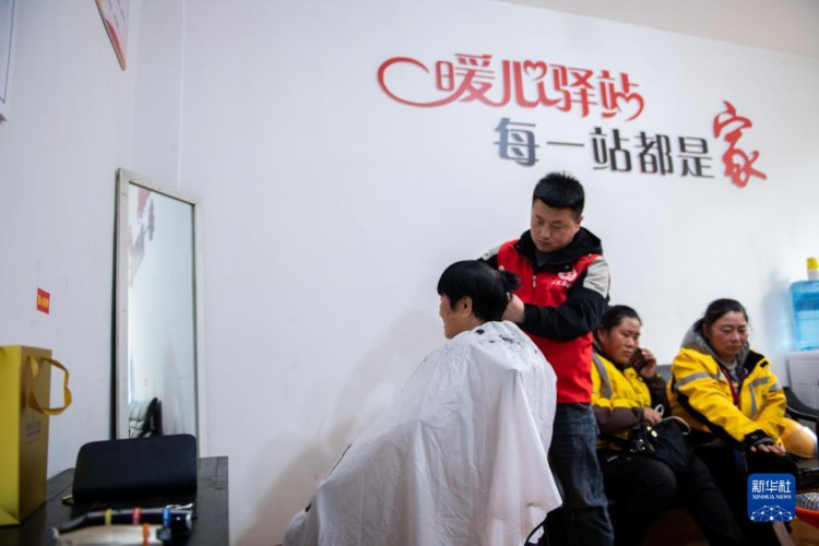 2月16日,在汨罗市归义镇友谊河社区“暖心驿站”,志愿者为户外劳动者义务剪发。