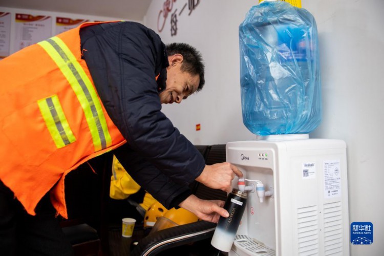 2月16日,在汨罗市归义镇友谊河社区“暖心驿站”,一名环卫工在接热水。