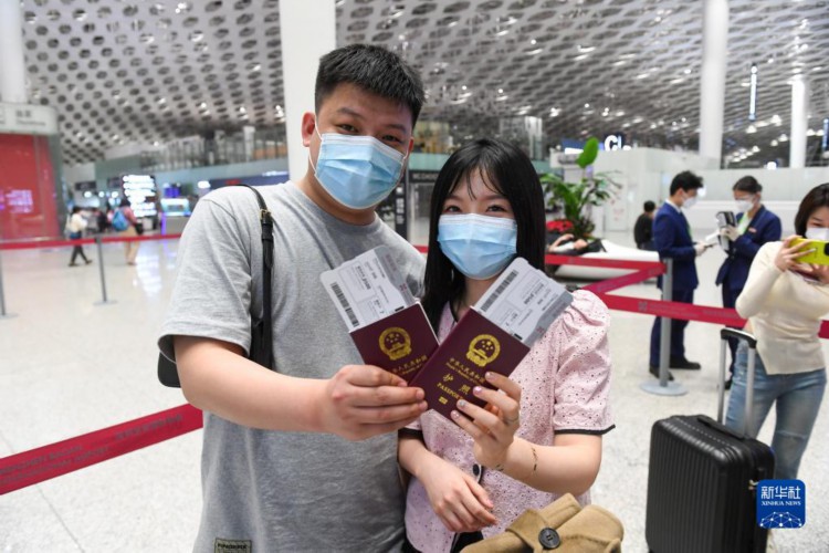 2月12日凌晨,在中国深圳,即将搭乘印尼狮航包机前往巴厘岛旅游的游客夫妇拿着护照和登机牌合影。