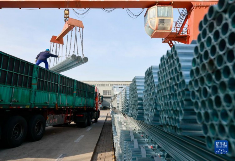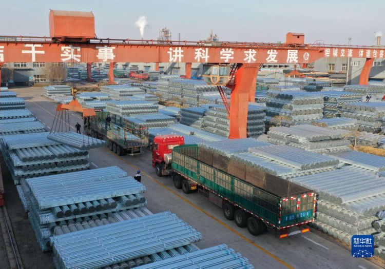2月19日,工人在唐山市丰南区一家镀锌钢管企业仓储区操作设备吊装镀锌钢管。