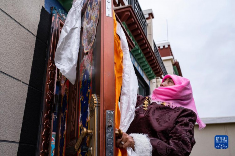 石秀次仁的家人往门上挂哈达,祝福新一年吉祥如意(2月19日摄)。