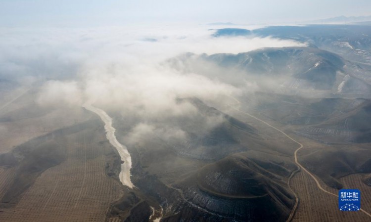 当日,宁夏吴忠市同心县的山谷间出现云海景观,农田、旱塬、公路在雾中若隐若现,景色壮美。