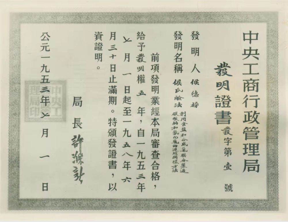 在天津渤化永利化工股份有限公司档案室,保存着一张发黄的证书,上面写着“发字第一号”“发明人:侯德榜”“发明名称:侯氏碱法”……这是1953年颁发的“新中国第一号发明证书”。