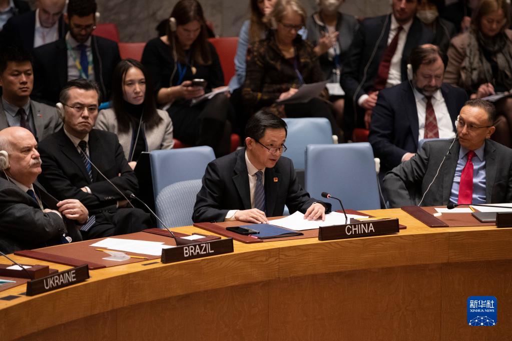 2月24日,在位于纽约的联合国总部,中国常驻联合国代表团临时代办戴兵在安理会乌克兰问题公开会上发言,阐述中方关于政治解决乌克兰危机的立场。新华社记者 谢锷 摄