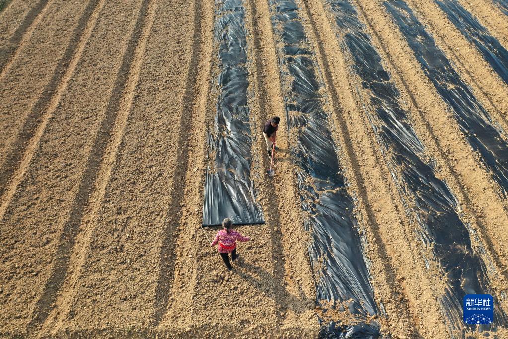 2月25日,农民在蒲庙镇田园里铺地膜(无人机照片)。