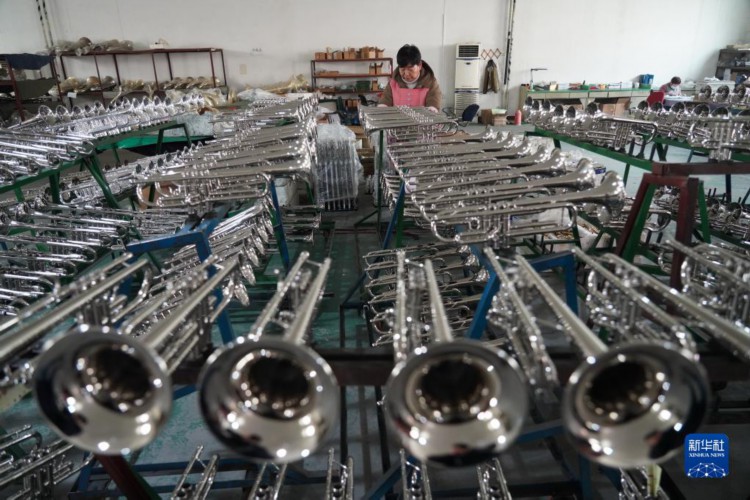 河北省武强县一家西洋乐器生产企业的员工在整理产品(2月23日摄)。