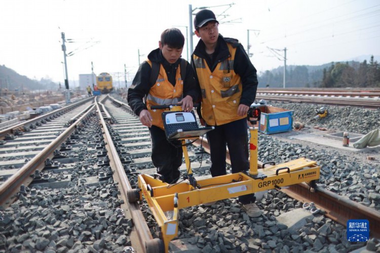 2月27日,在贵南高铁都匀东站附近,贵阳高铁工务段的技术人员使用测量小车对钢轨进行检测。
