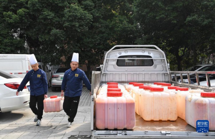 2月25日,成都一家火锅食府员工将收集的废油搬上运输车。