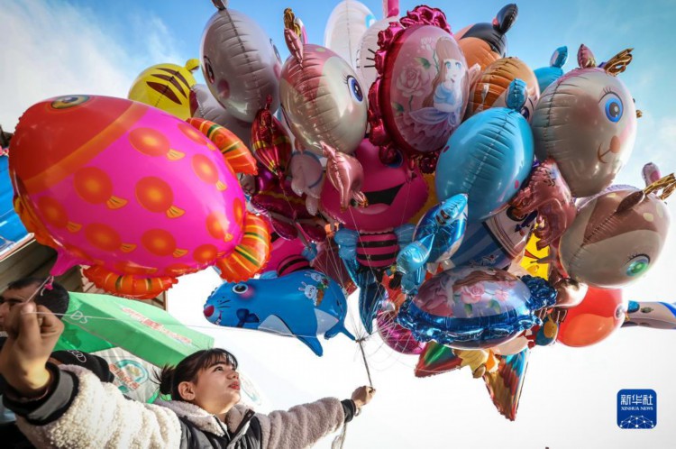 2月26日,在托克扎克镇农贸市场,商贩在给顾客挑选气球。